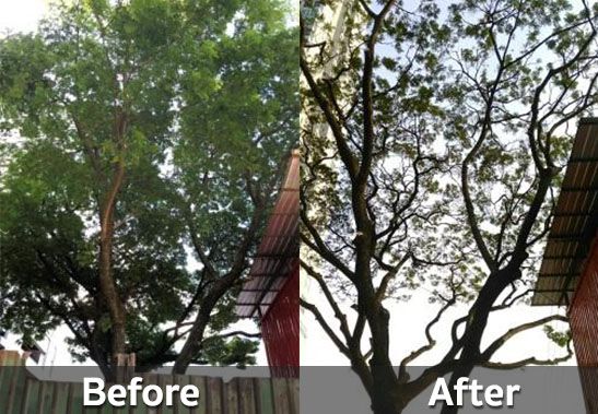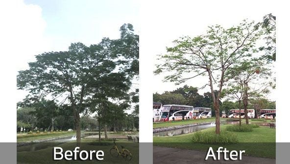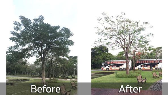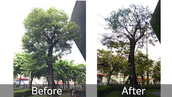 รุกขกร ตัดแต่งต้นจามจุรี โดยทำการเก็บตอ ตัดกิ่งแห้ง ตัดกิ่งที่ระอาคาร ตัดกิ่งเพื่อลดน้ำหนัก และวางโครงสร้าง