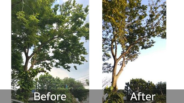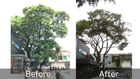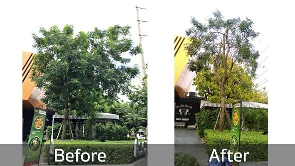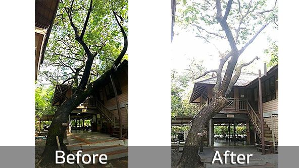 รุกขกร ตัดแต่งต้นจามจุรี โดยทำการเก็บตอ ตัดกิ่งแห้ง ตัดกิ่งที่ระอาคาร ตัดกิ่งเพื่อลดน้ำหนัก และวางโครงสร้าง ลดความสูง